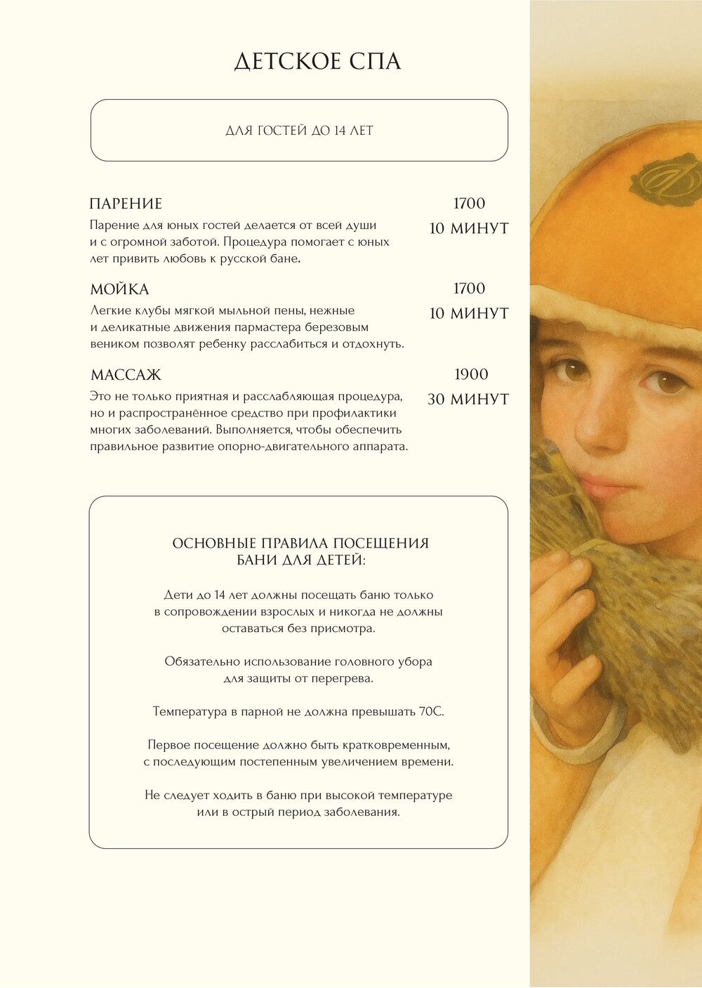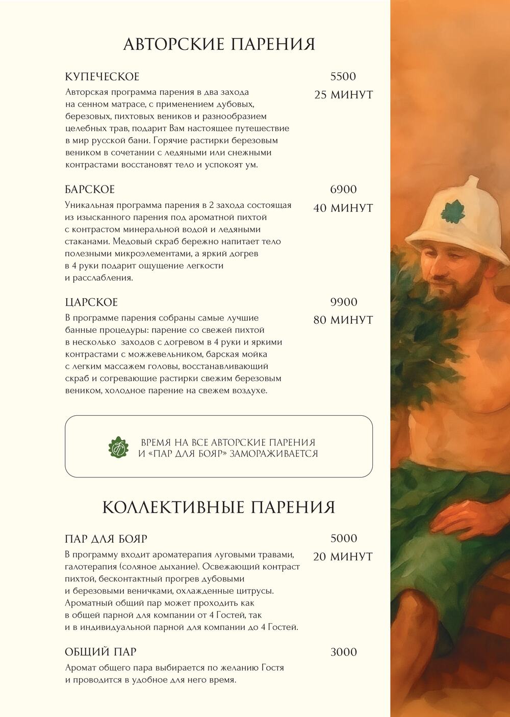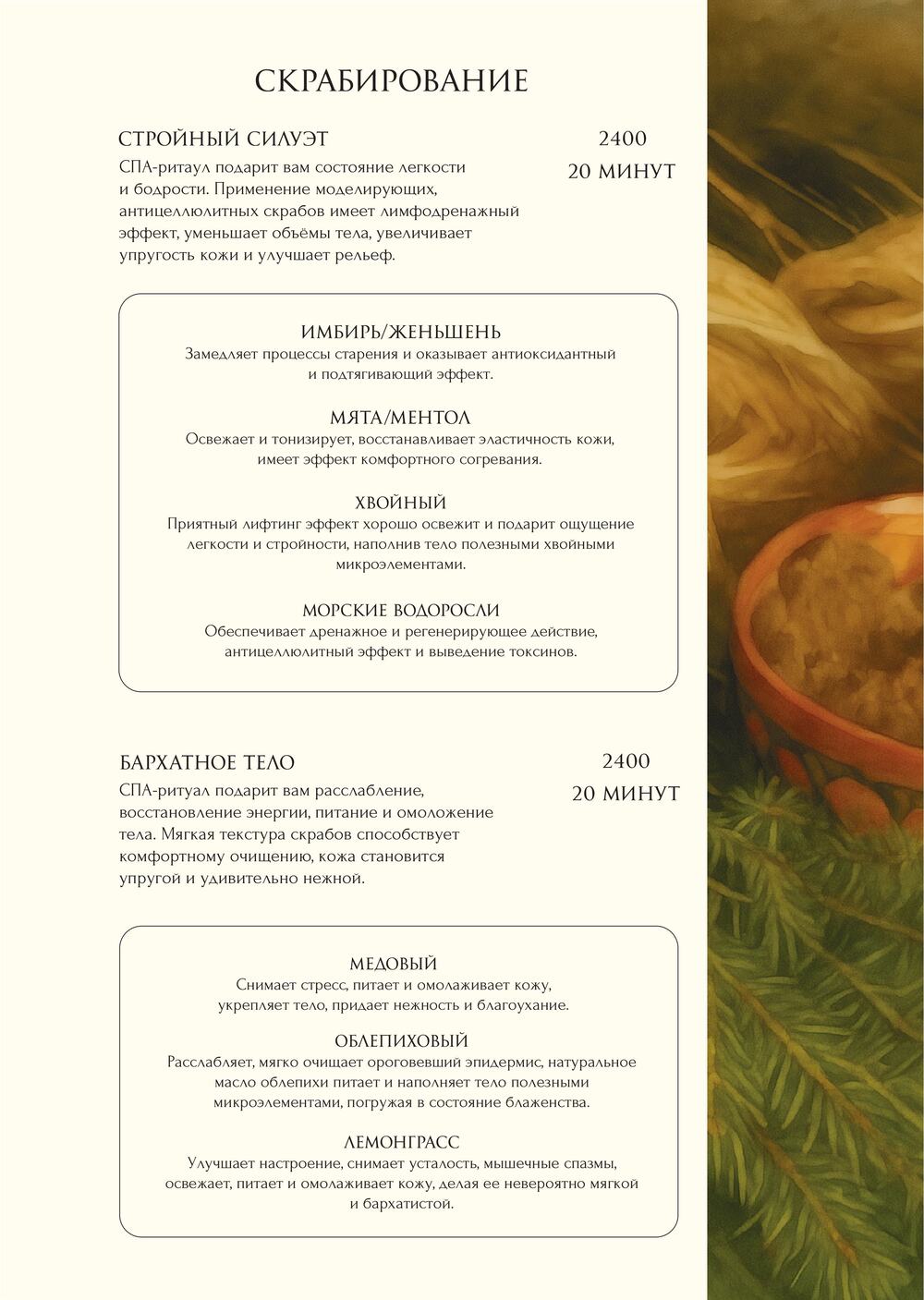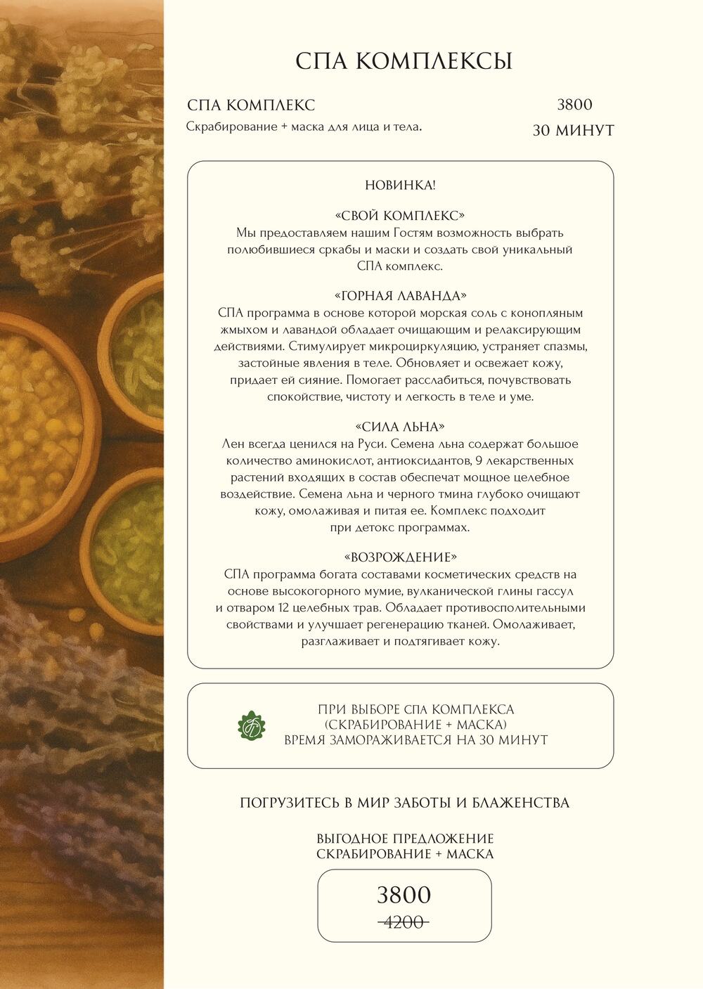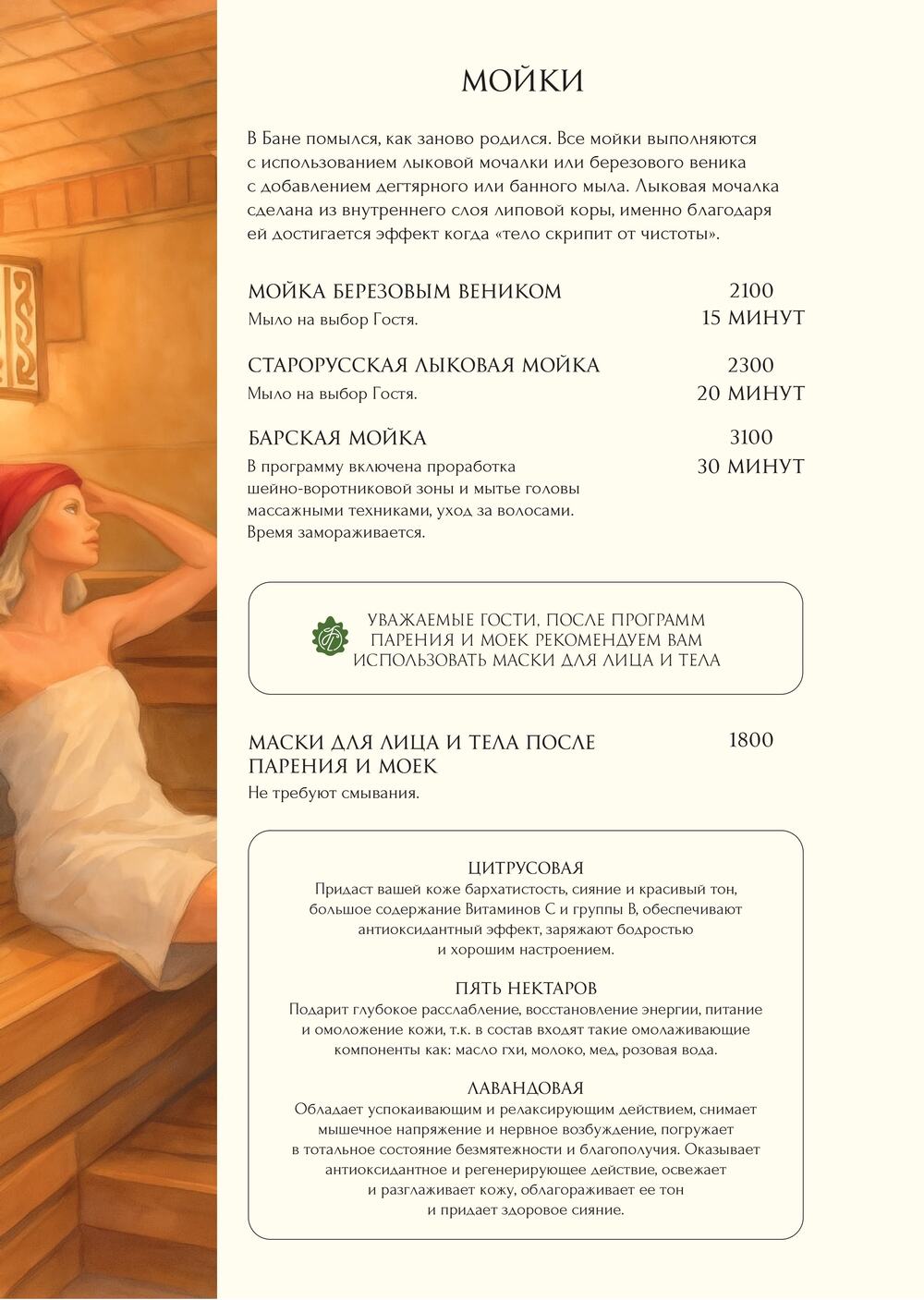 В нашем ассортименте представлено широкое разнообразие СПА-процедур. Среди них — индивидуальные парения и мойки, массажи. Кроме того, рады предложить вам комплексные СПА-программы, представленные скрабами и масками. Огромная польза для укрепления здоровья и поддержания красоты!
